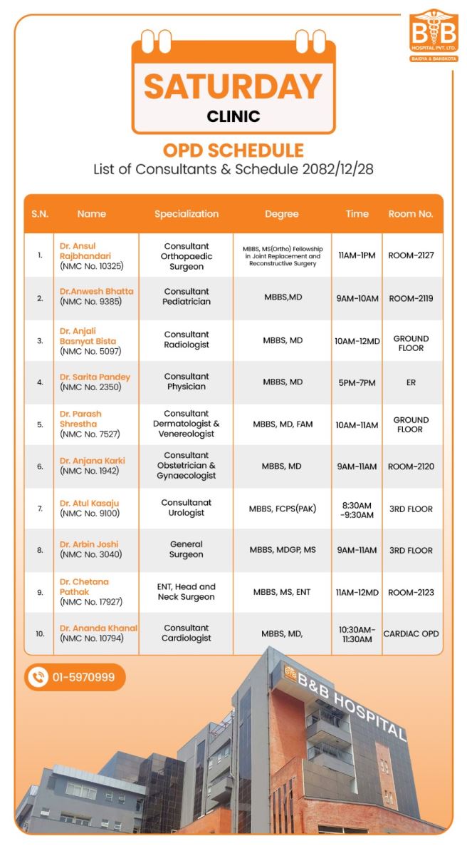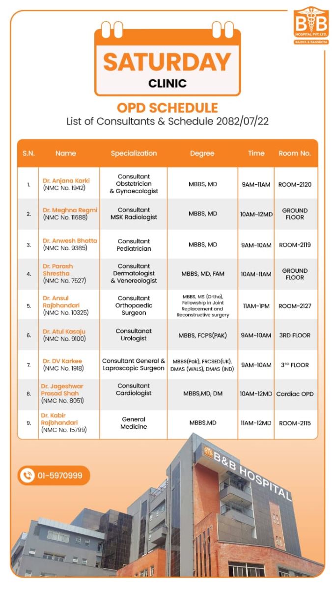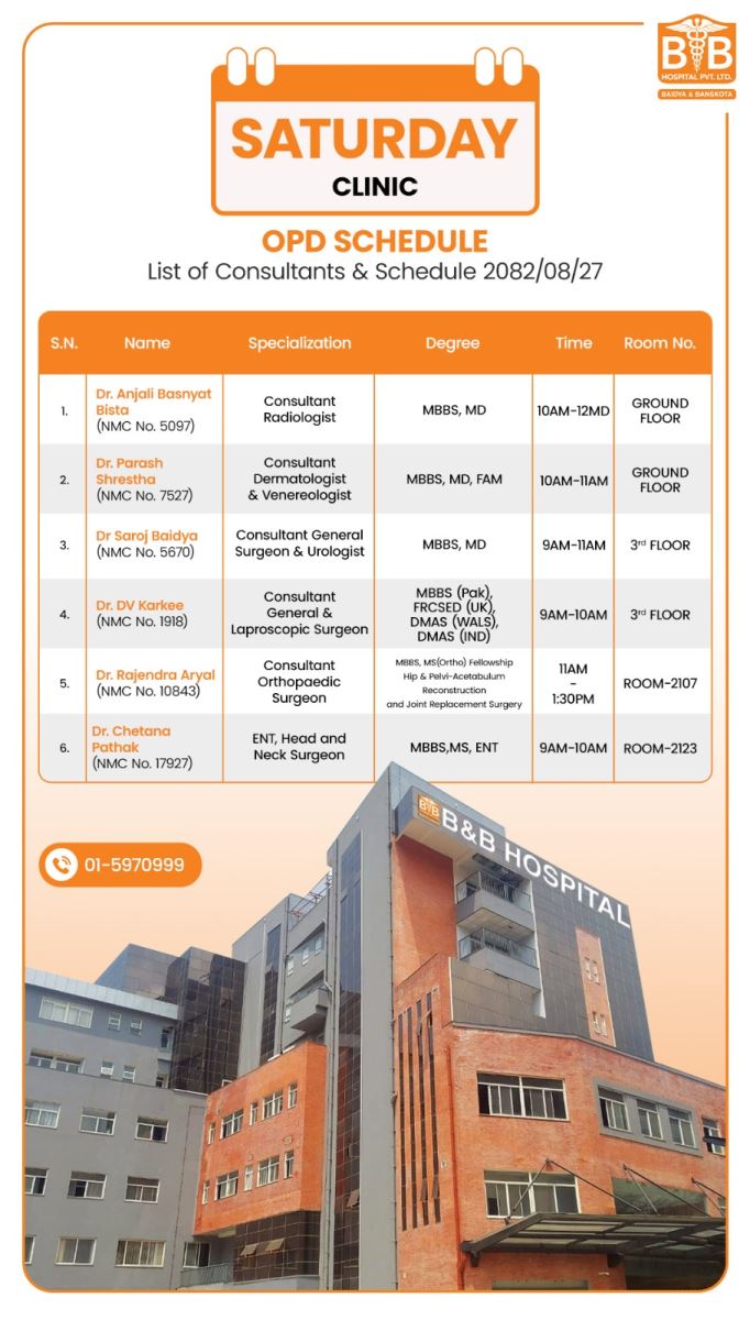 In our unwavering commitment to providing exceptional care to our valued patients, we are thrilled to announce that we have expanded our outpatient department (OPD) services to include Saturdays. This decision reflects our dedication to enhancing accessibility and convenience for all those who rely on our healthcare facilities.
